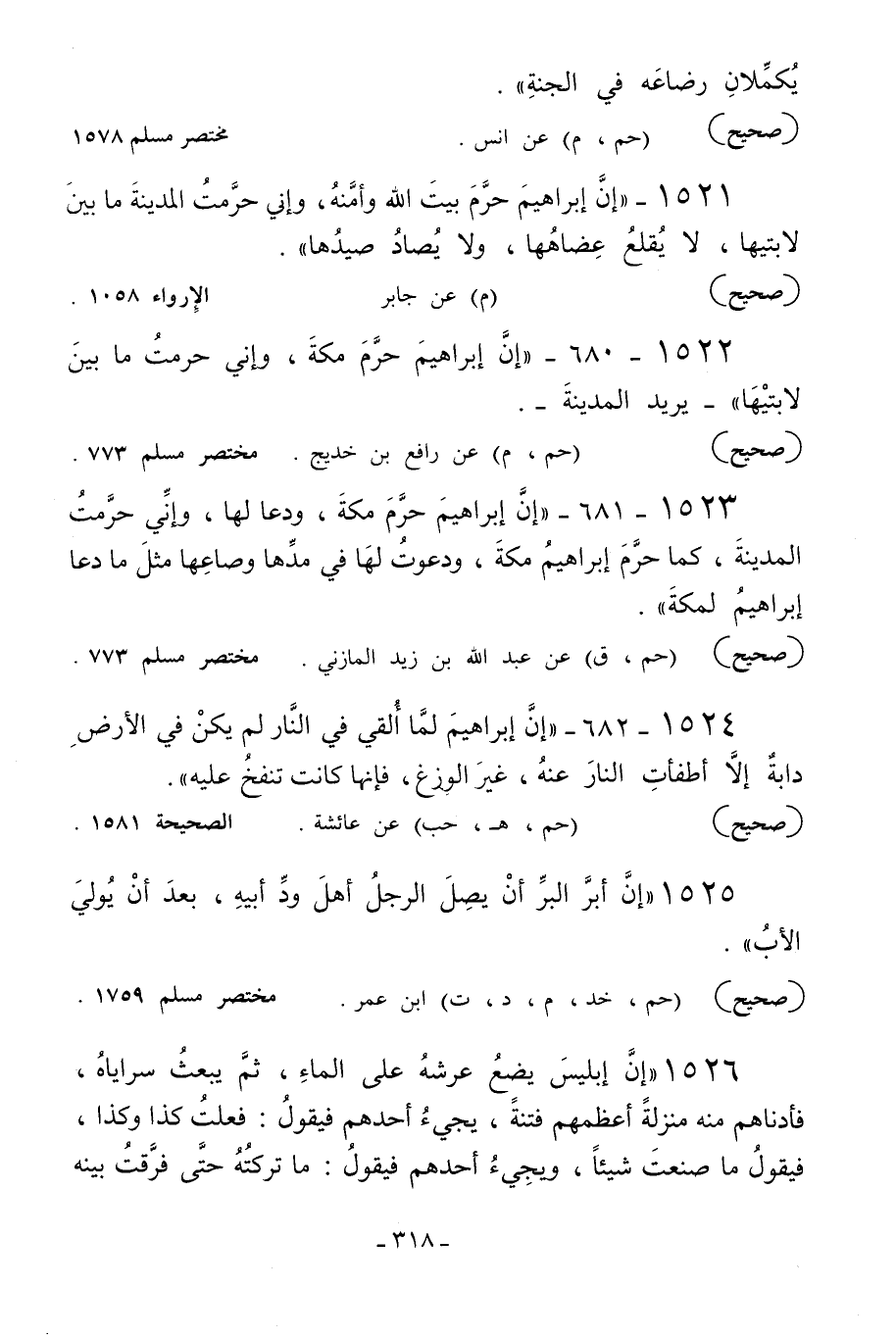 1521 - «إن إبراهيم حرم بيت الله وأمنه وإني حرمت المدينة ما بين لابتيها لا يقلع عضاهها ولا يصاد صيدها» .