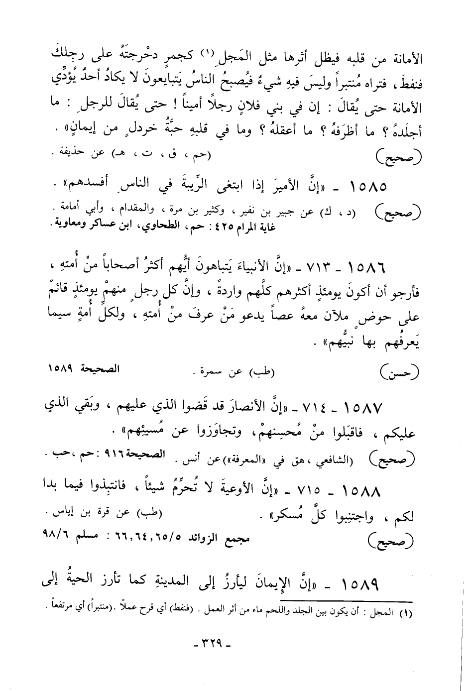 1586 - 713 - «إن الأنبياء يتباهون أيهم أكثر أصحابا من أمته فأرجو أن أكون يومئذ أكثرهم كلهم واردة وإن كل رجل منهم يومئذ قائم على حوض ملآن معه عصا يدعو من عرف من أمته ولكل أمة سيما يعرفهم بها نبيهم» .