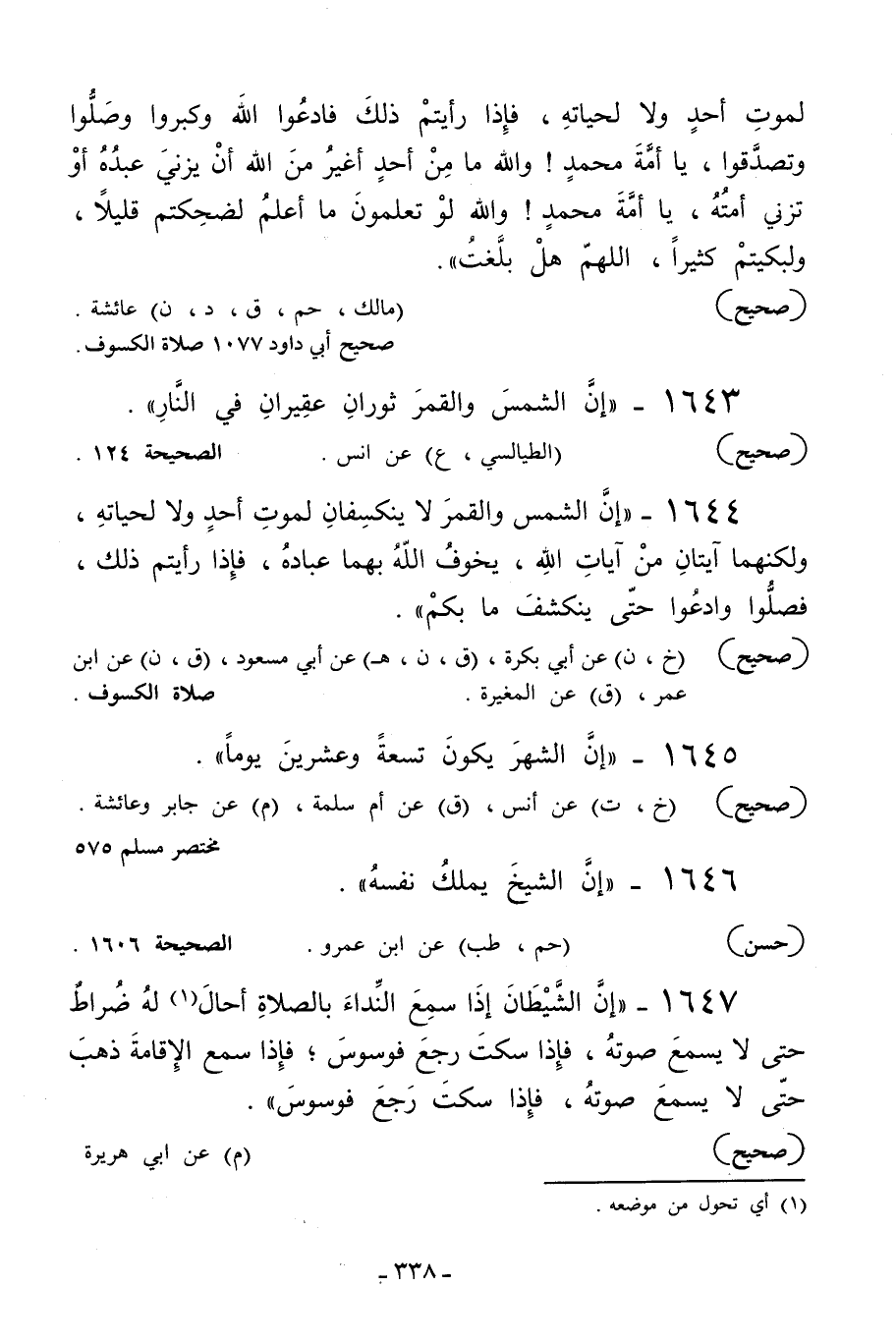 1644 - «إن الشمس والقمر لا ينكسفان لموت أحد ولا لحياته ولكنهما آيتان من آيات الله يخوف الله بهما عباده فإذا رأيتم ذلك فصلوا وادعوا حتى ينكشف ما بكم» .