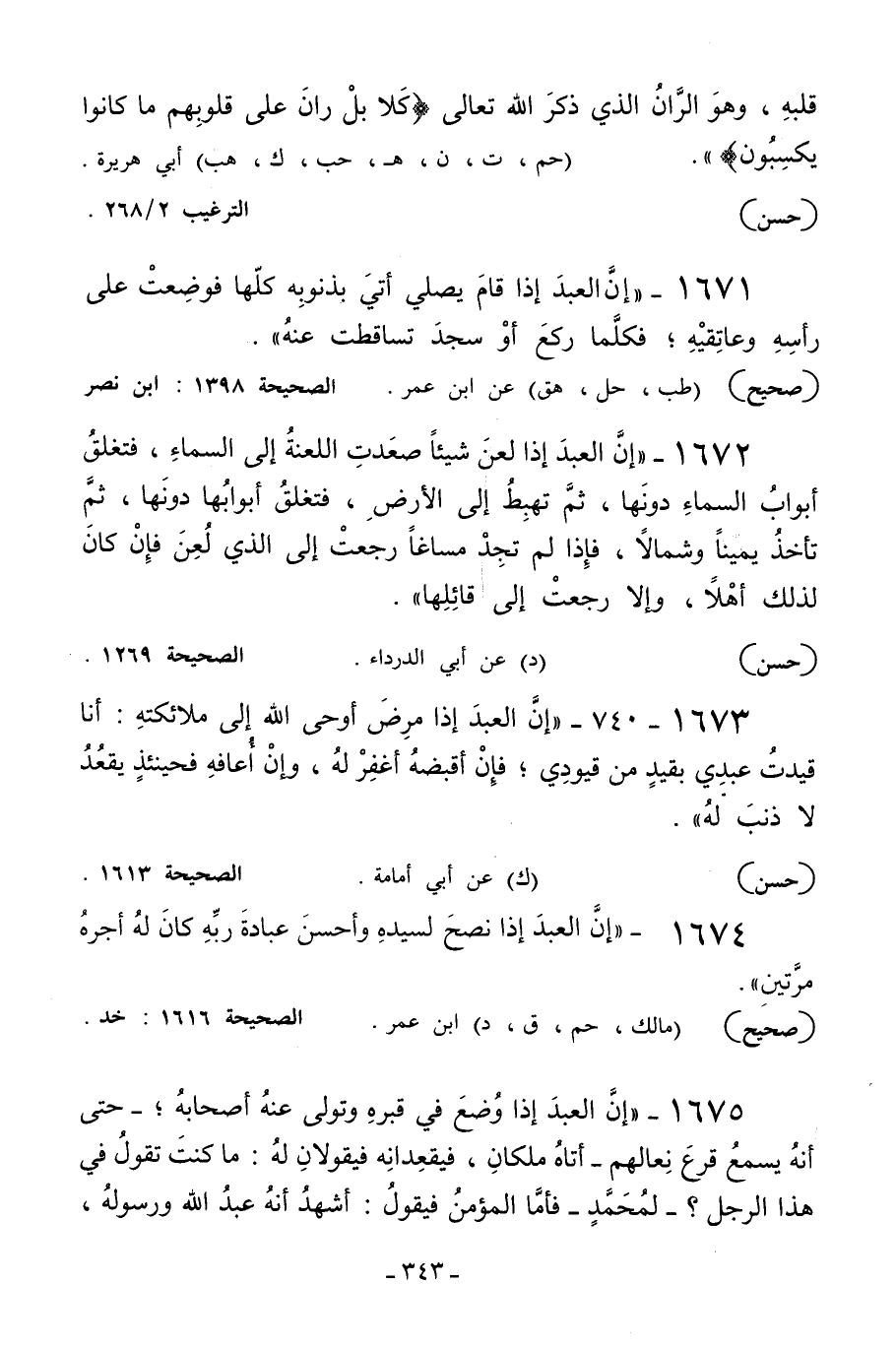 1671 - «إن العبد إذا قام يصلي أتي بذنوبه كلها فوضعت على رأسه وعاتقيه فكلما ركع أو سجد تساقطت عنه» .