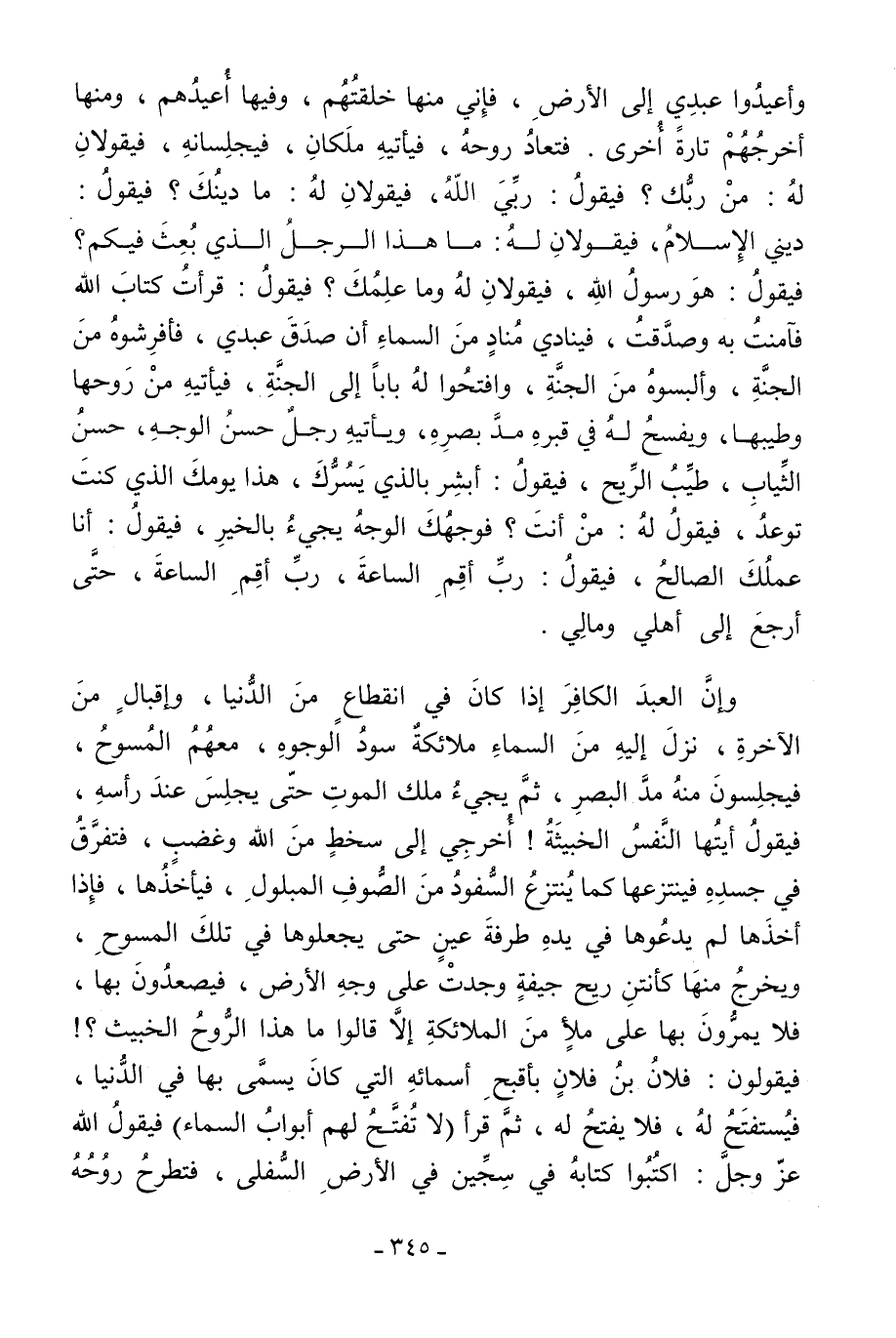 وأعيدوا عبدي إلى الأرض فإني منها خلقتهم وفيها أعيدهم ومنها أخرجهم تارة أخرى; فتعاد روحه فيأتيه ملكان فيجلسانه فيقولان له: من ربك؟ فيقول: ربي الله فيقولان له: ما دينك؟ فيقول: ديني الإسلام فيقولان له: ما هذا الرجل الذي بعث فيكم؟ فيقول: هو رسول الله فيقولان له: وما علمك؟ فيقول: قرأت كتاب الله فآمنت به وصدقت فينادي مناد من السماء: أن صدق عبدي فأفرشوه من الجنة وألبسوه من الجنة وافتحوا له بابا إلى الجنة فيأتيه من روحها وطيبها ويفسح له في قبره مد بصره ويأتيه رجل حسن الوجه حسن الثياب طيب الريح فيقول: أبشر بالذي يسرك هذا يومك الذي كنت توعد فيقول له: من أنت؟ فوجهك الوجه يجيء بالخير فيقول: أنا عملك الصالح فيقول: رب أقم الساعة رب أقم الساعة؟ حتى أرجع إلى أهلي ومالي.