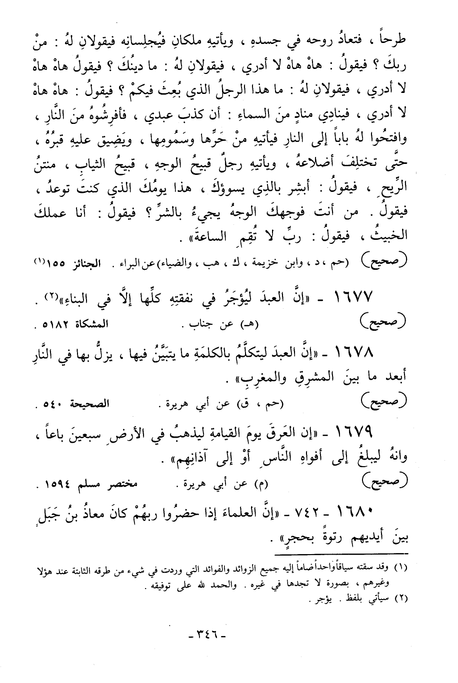 1679 - «إن العرق يوم القيامة ليذهب في الأرض سبعين باعا وإنه ليبلغ إلى أفواه الناس أو إلى آذانهم» .