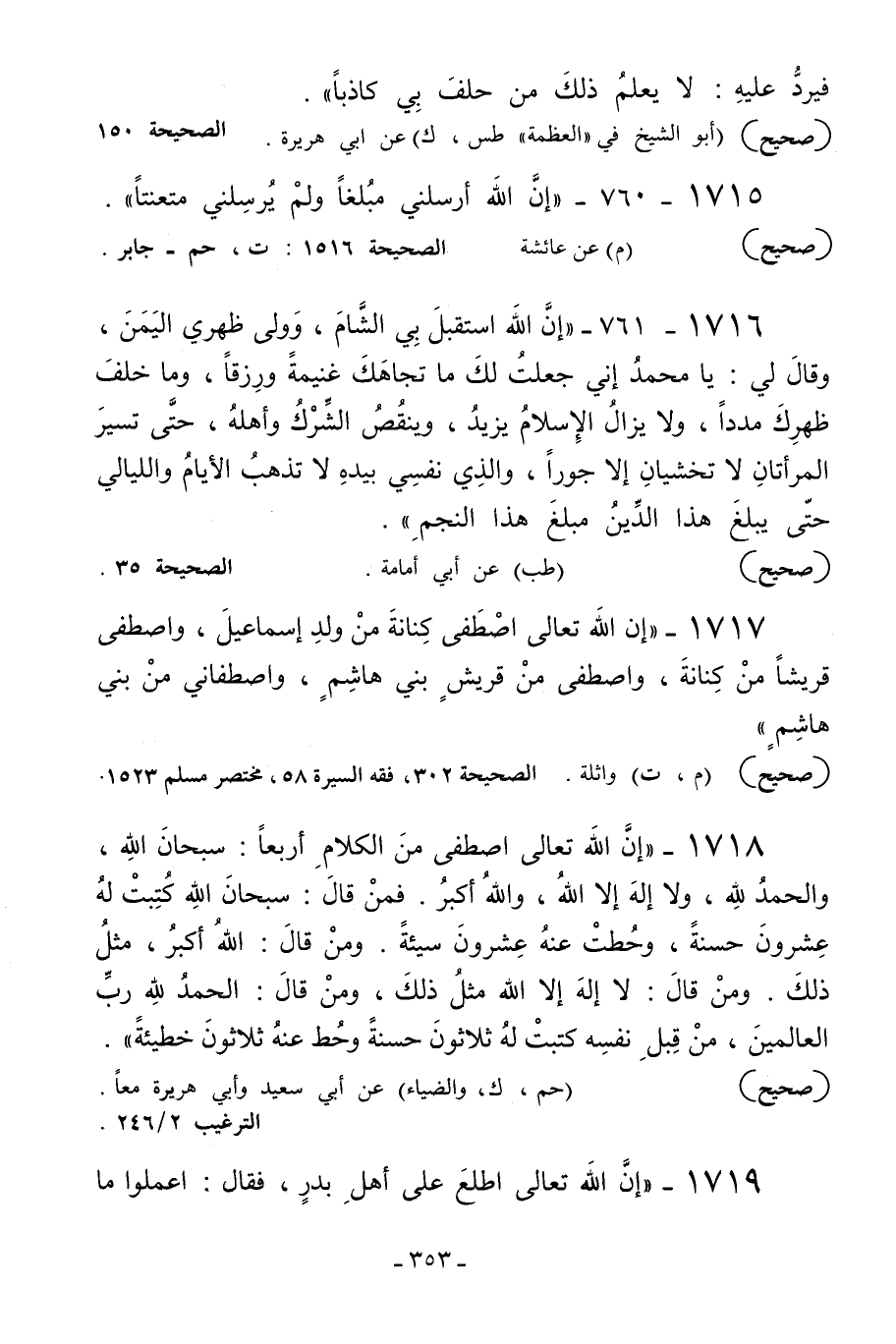 1717 - «إن الله تعالى اصطفى كنانة من ولد إسماعيل وصطفى قريشا من كنانة واصطفى من قريش بني هاشم واصطفاني من بني هاشم» .