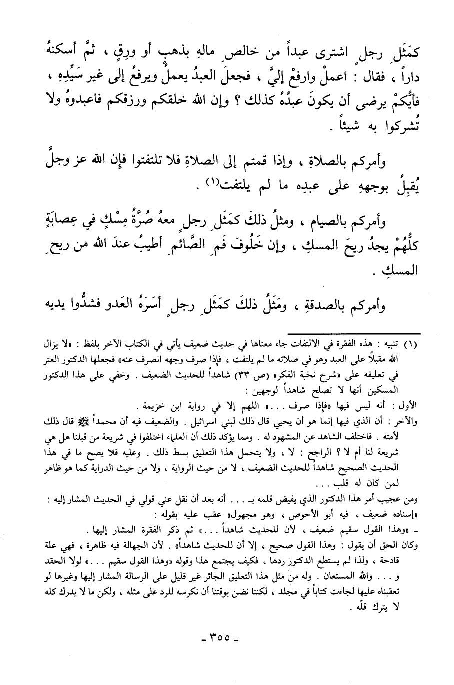 1 تنبيه: هذه الفقرة في الالتفات جاء معناها في حديث ضعيف يأتي في الكتاب الآخر بلفظ: [لا يزال الله مقبلا على العبد وهو في صلاته ما لم يلتفت, فإذا صرف وجهه انصرف عنه] . فجعلها الدكتور العتر في تعليقه على [شرح نخبة الفكر] ص 33 شاهدا للحديث الضعيف. وخفي على هذا الدكتور المسكين أنها لا تصلح شاهدا لوجهين: