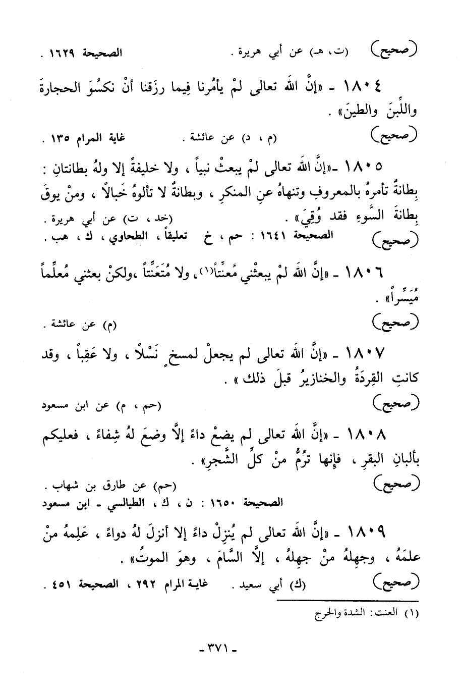 1808 - «إن الله تعالى لم يضع داء إلا وضع له شفاء فعليكم بألبان البقر فإنها ترم من كل الشجر» .