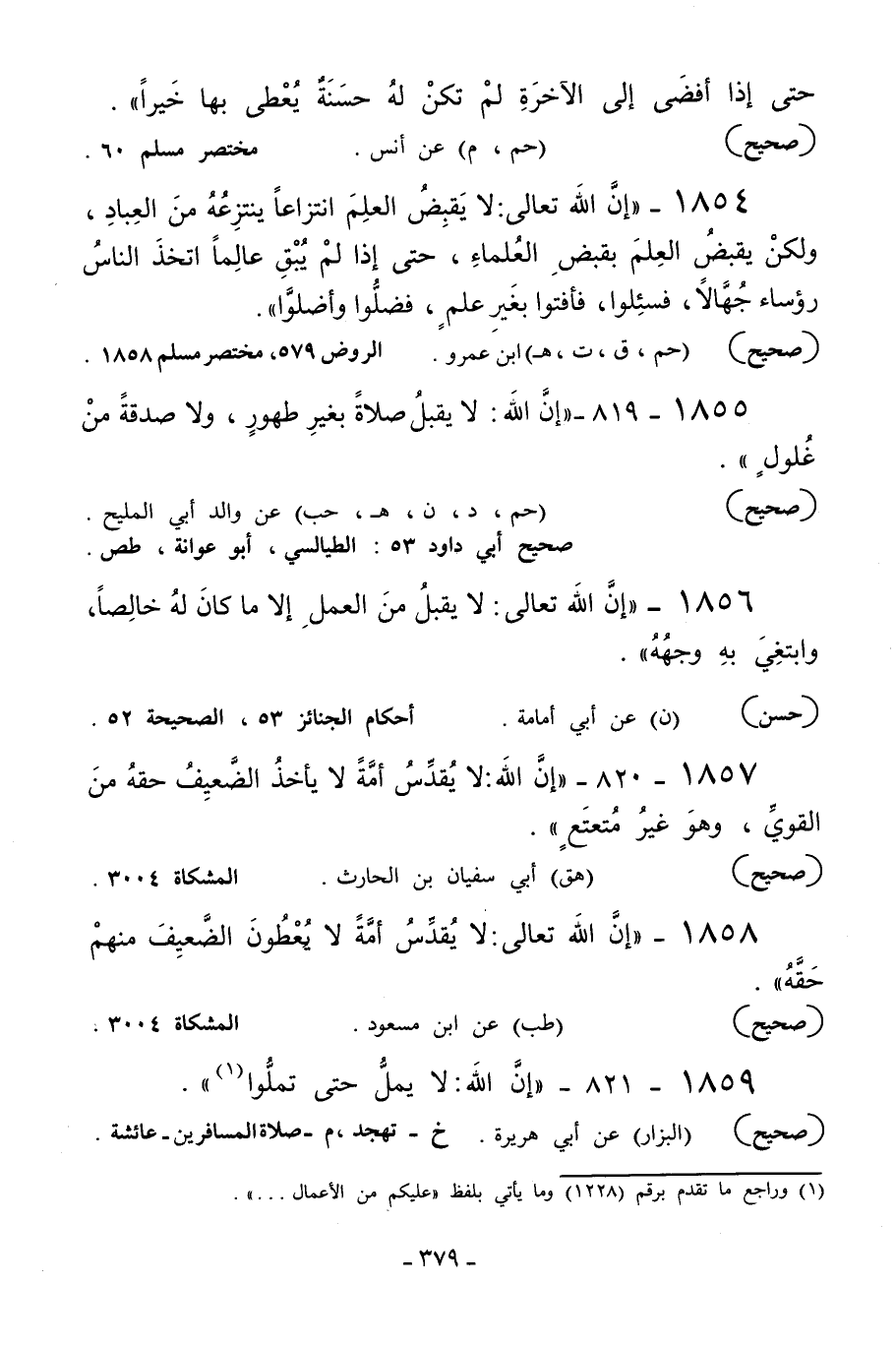 1854 - «إن الله تعالى لا يقبض العلم انتزاعا ينتزعه من العباد ولكن يقبض العلم بقبض العلماء حتى إذا لم يبق عالما اتخذ الناس رءوساء جهالا فسئلوا فأفتوا بغير علم فضلوا وأضلوا» .