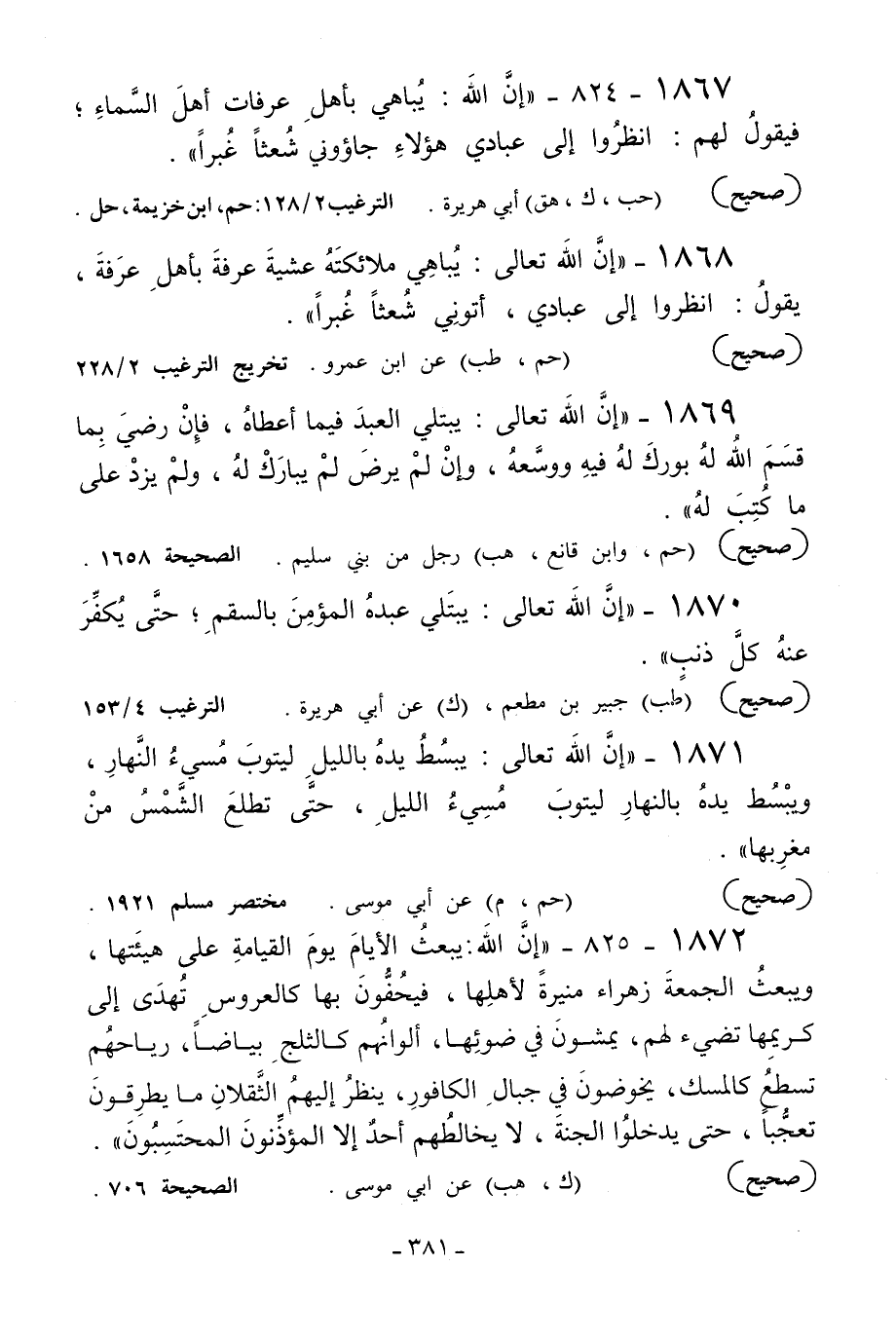 1868 - «إن الله تعالى يباهي ملائكته عشية عرفة بأهل عرفة يقول: انظروا إلى عبادي أتوني شعثا غبرا» .