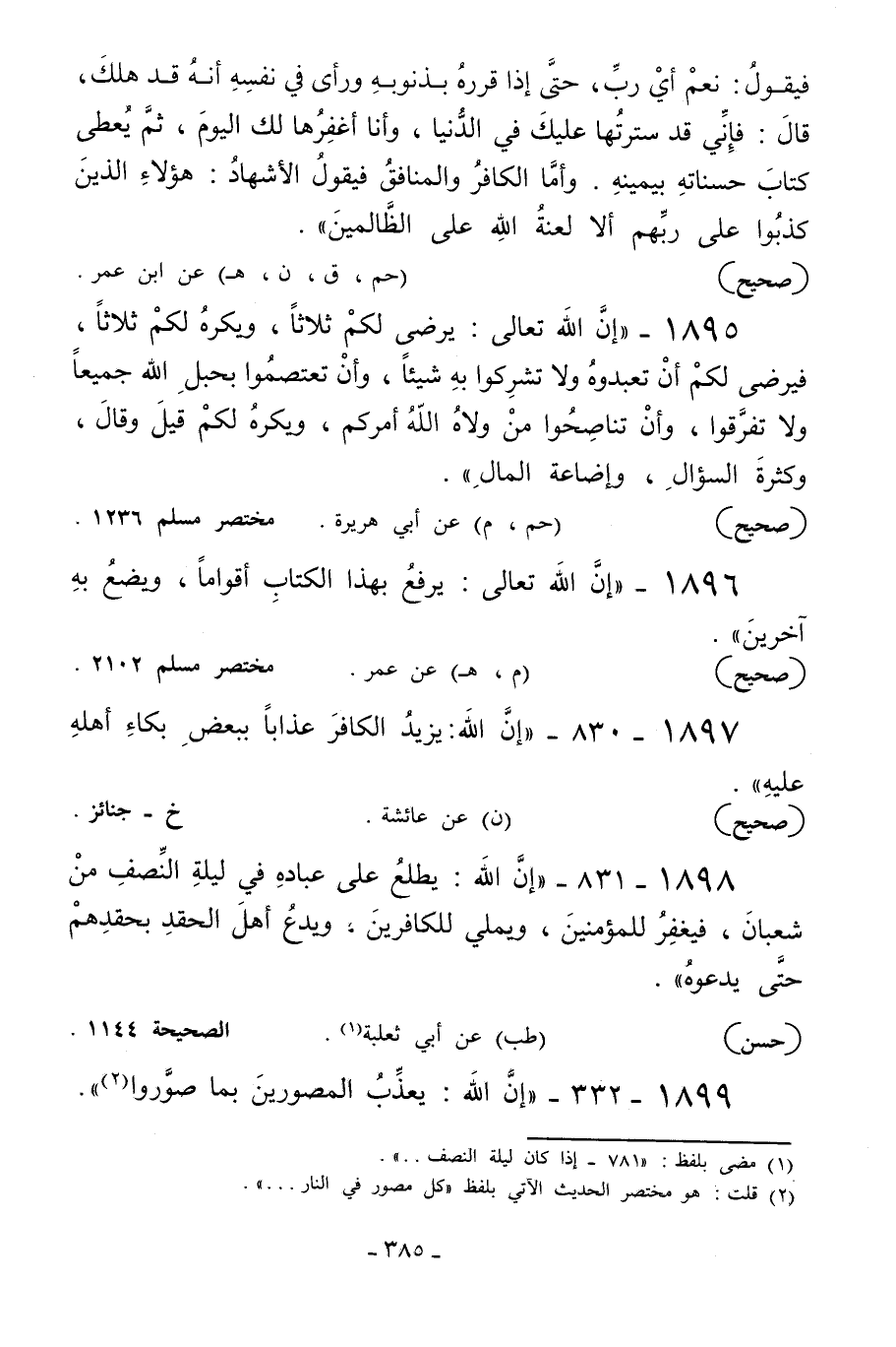 1895 - «إن الله تعالى يرضى لكم ثلاثا ويكره لكم ثلاثا فيرضى لكم: أن تعبدوه ولا تشركوا به شيئا وأن تعتصموا بحبل الله جميعا ولا تفرقوا وأن تناصحوا من ولاه الله أمركم ويكره لكم: قيل وقال وكثرة السؤال وإضاعة المال» .