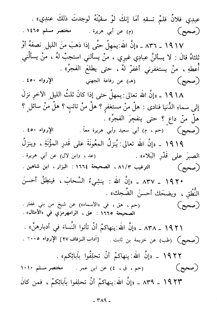 1918 - «إن الله تعالى يمهل حتى إذا كان ثلث الليل الآخر نزل إلى سماء الدنيا فنادى: هل من مستغفر؟ هل من تائب؟ هل من سائل؟ هل من داع؟ حتى ينفجر الفجر» .