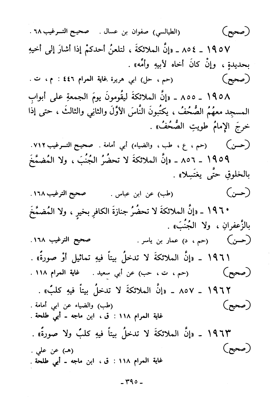 1959 - 856 - «إن الملائكة لا تحضر الجنب ولا المضمخ بالخلوق حتى يغتسلا» .