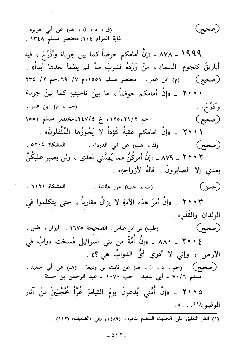 1999 - 878 - «إن أمامكم حوضا كما بين جرباء وأذرح فيه أباريق كنجوم السماء من ورده فشرب منه لم يظمأ بعدها أبدا» .