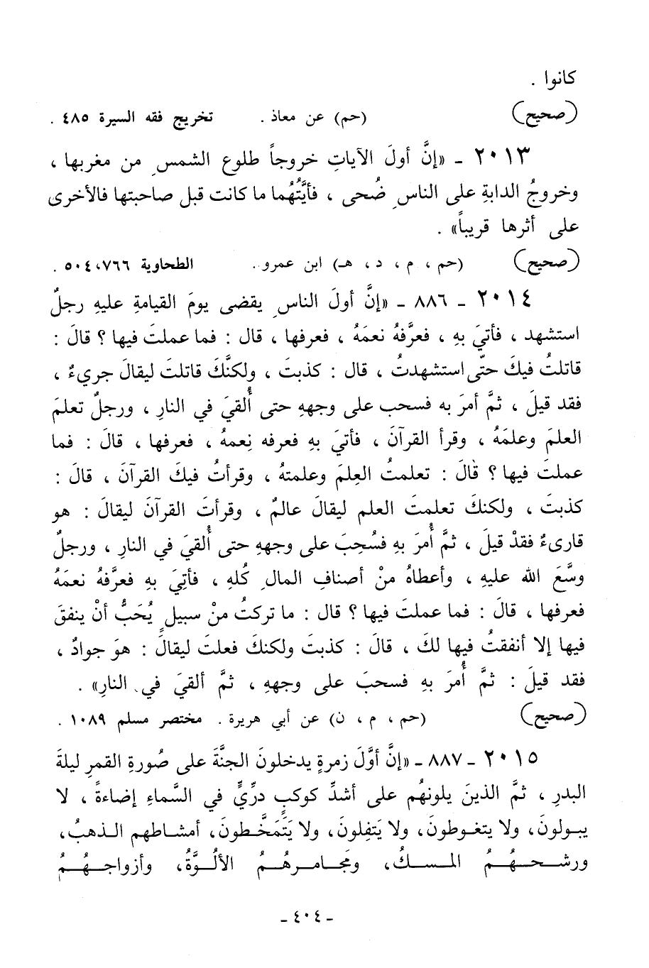 2013 - «إن أول الآيات خروجا طلوع الشمس من مغربها وخروج الدابة على الناس ضحى فأيتهما ما كانت قبل صاحبتها فالأخرى على أثرها قريبا» .