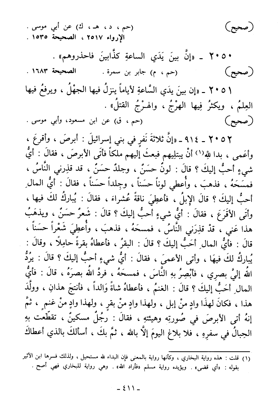 2052 - 914 - "إن ثلاثة نفر في بني إسرائيل: أبرص وأقرع وأعمى بدا1 لله أن يبتليهم فبعث إليهم ملكا فأتى الأبرص فقال: أي شيء أحب إليك؟ قال: لون حسن وجلد حسن قد قذرني الناس فمسحه فذهب وأعطي لونا حسنا وجلدا حسنا فقال: أي المال أحب إليك؟ قال: الإبل فأعطي ناقة عشراء فقال: يبارك لك فيها; وأتى الأقرع فقال: أي شيء أحب إليك؟ قال: شعر حسن ويذهب هذا عني قد قذرني الناس فمسحه فذهب وأعطي شعرا حسنا قال: فأي المال أحب إليك؟ قال: البقر فأعطاه بقرة حاملا وقال: يبارك لك فيها; وأتى الأعمى فقال: أي شيء أحب إليك؟ قال: يرد الله إلي بصري فأبصر به الناس فمسحه فرد الله إليه بصره قال: فأي المال أحب إليك؟ قال: الغنم فأعطاه شاة والدا فأنتج هذان وولد هذا فكان لهذا واد من إبل ولهذا واد من بقر ولهذا واد من غنم; ثم إنه أتى الأبرص في صورته وهيئته فقال: رجل مسكين تقطعت به الحبال في سفره فلا بلاغ اليوم إلا بالله ثم بك أسألك بالذي أعطاك