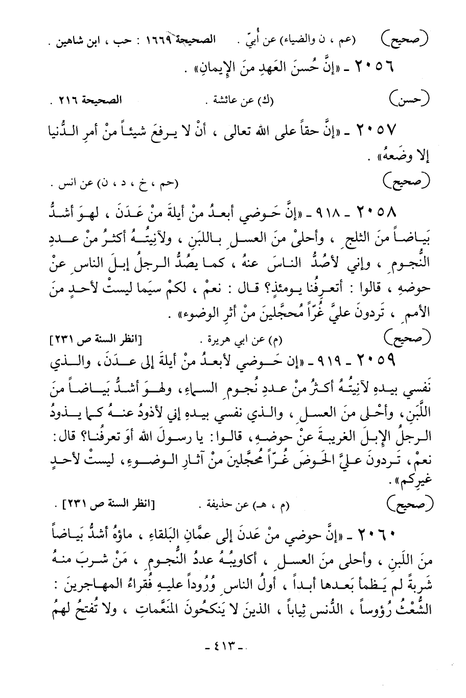 2059 - «إن حوضي لأبعد من أيلة إلى عدن والذي نفسي بيده لآنيته أكثر من عدد نجوم السماء ولهو أشد بياضا من اللبن وأحلى من العسل والذي نفسي بيده إني لأذود عنه كما يذود الرجل الإبل الغريبة عن حوضه قالوا: يا رسول الله أوتعرفنا؟ قال: نعم تردون علي الحوض غرا محجلين من آثار الوضوء ليست لأحد غيركم» .
