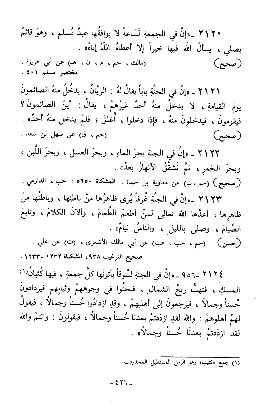2124 - 956 - «إن في الجنة لسوقا يأتونها كل جمعة فيها كثبان1 المسك فتهب ريح الشمال فتحثوا في وجوههم وثيابهم فيزدادون حسنا وجمالا فيرجعون إلى أهليهم وقد ازدادوا حسنا وجمالا فيقول لهم أهلوهم: والله لقد ازددتم بعدنا حسنا وجمالا فيقولون: وأنتم والله لقد ازددتم بعدنا حسنا وجمالا» .