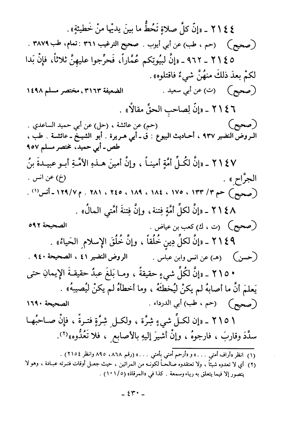 2151 - «إن لكل شيء شرة ولكل شرة فترة فإن صاحبها سدد وقارب فارجوه وإن أشير إليه بالأصابع فلا تعدوه» 2.