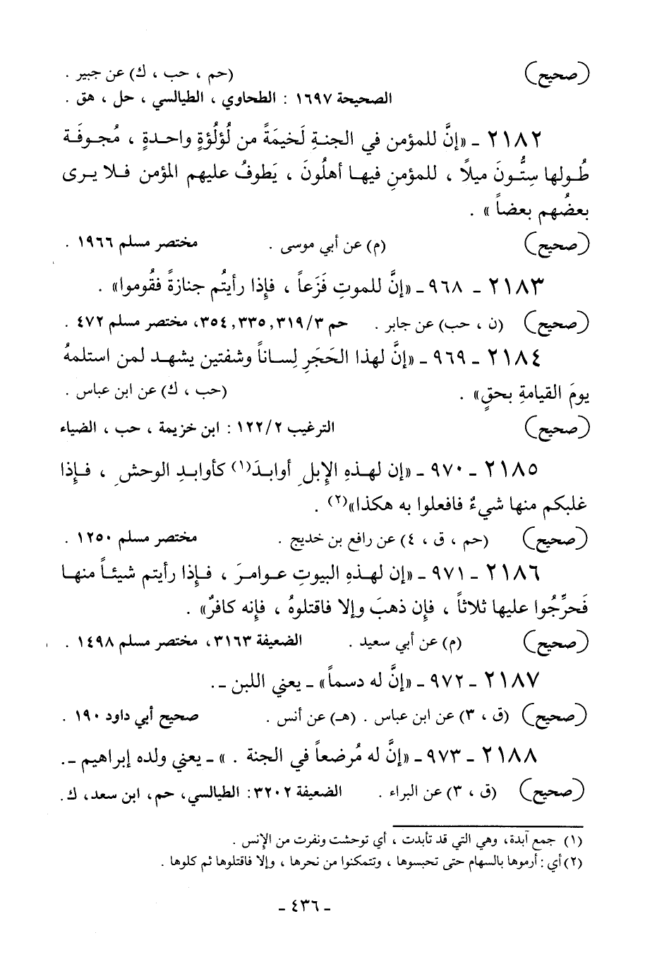 2185 - 970 - «إن لهذه الإبل أوابد1 كأوابد الوحش فإذا غلبكم منها شيء فافعلوا به هكذا2» .
