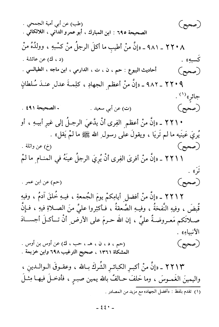 2210 - «إن من أعظم الفرى أن يدعى الرجل إلى غير أبيه أو يرى عينيه ما لم تريا ويقول على رسول الله صلى الله عليه وسلم ما لم يقل» .