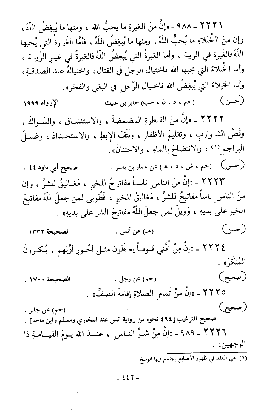 2222 - «إن من الفطرة: المضمضة والاستنشاق والسواك وقص الشوارب وتقليم الأظفار ونتف الإبط والاستحداد وغسل البراجم1 والانتضاح بالماء والاختتان» .
