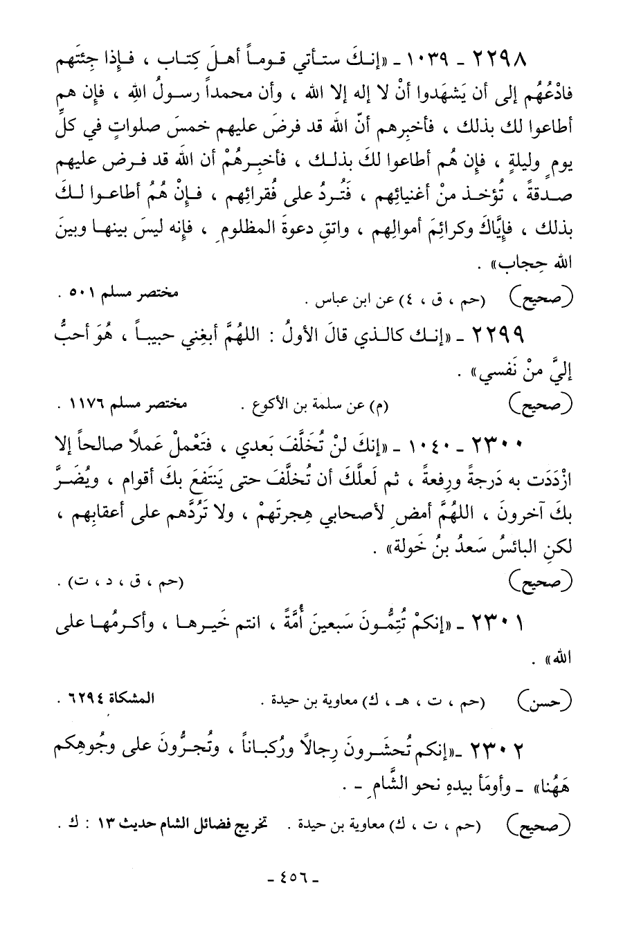 2300 - 1040 - «إنك لن تخلف بعدي فتعمل عملا صالحا إلا ازددت به درجة ورفعة ثم لعلك أن تخلف حتى ينتفع بك أقوام ويضر بك آخرون اللهم أمض لأصحابي هجرتهم ولا تردهم على أعقابهم لكن البائس سعد بن خولة» .