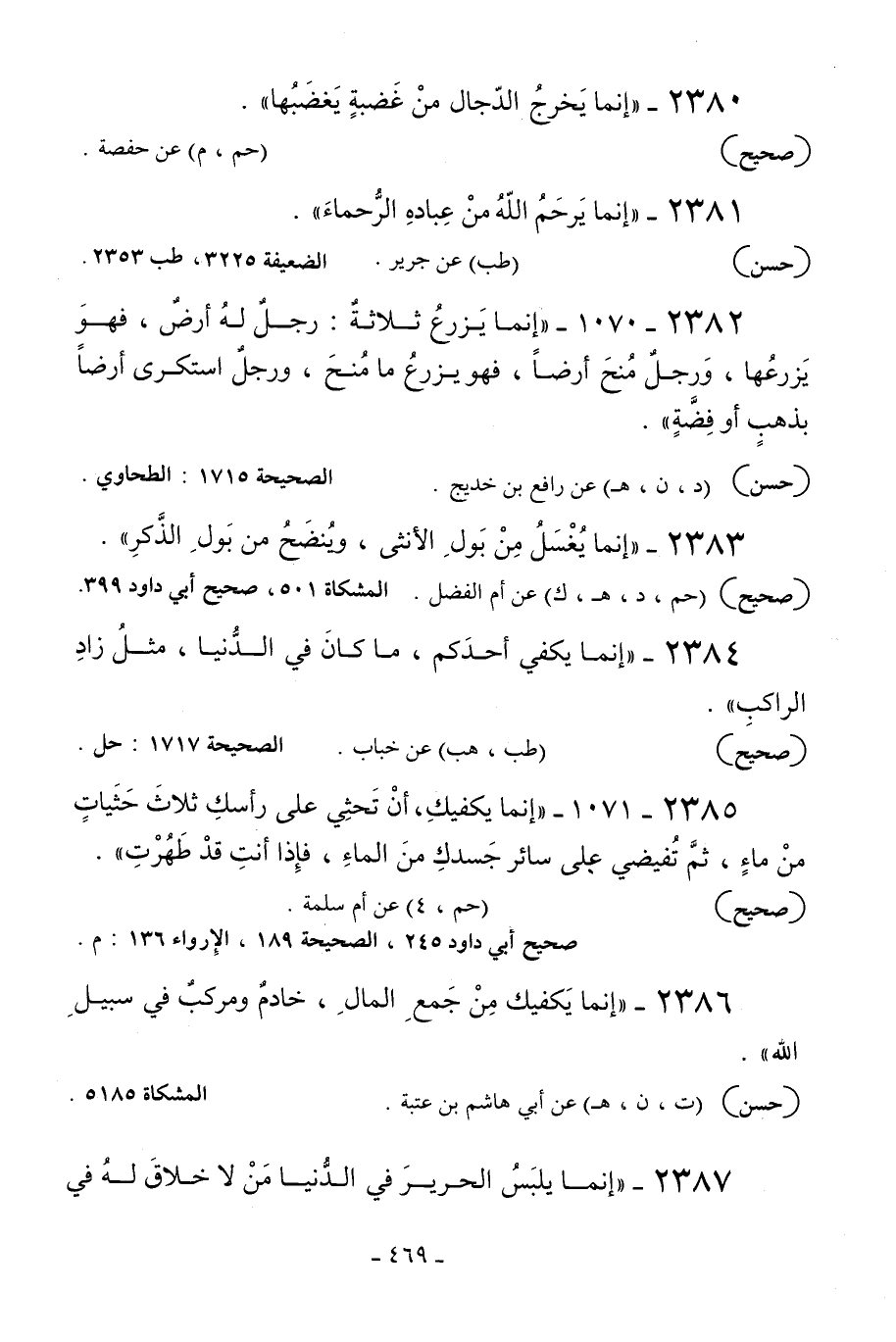 2385 - 1071 - «إنما يكفيك أن تحثي على رأسك ثلاث حثيات من ماء ثم تفيضي على سائر جسدك من الماء فإذا أنت قد طهرت» .