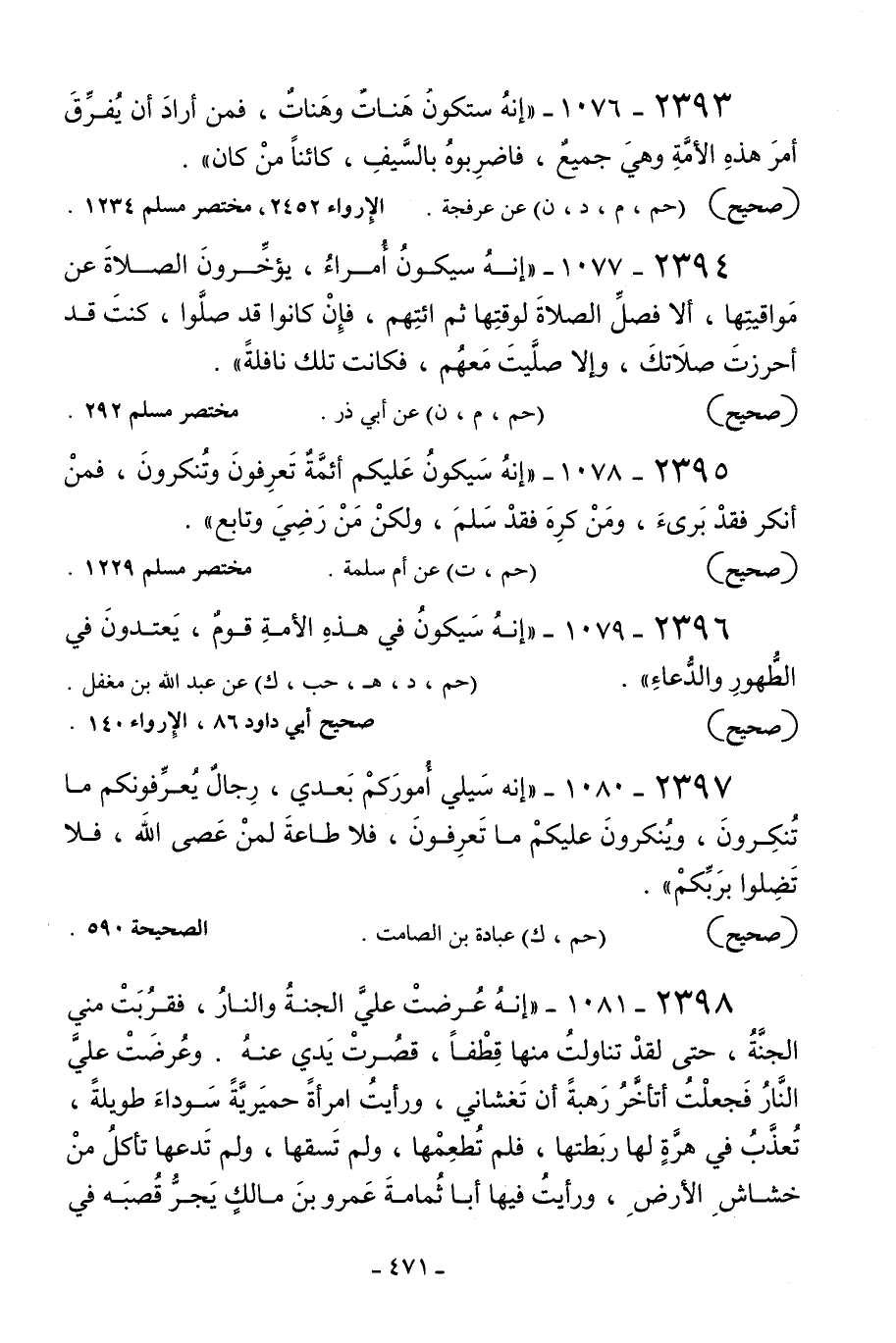2395 - 1078 - «إنه سيكون عليكم أئمة تعرفون وتنكرون فمن أنكر فقد برئ ومن كره فقد سلم ولكن من رضي وتابع» .