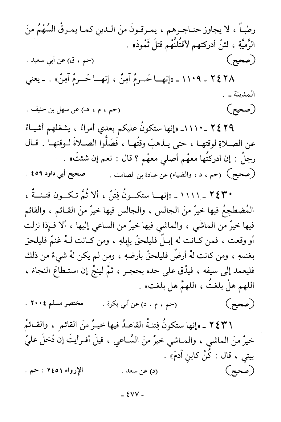 2431 - «إنها ستكون فتنة القاعد فيها خير من القائم والقائم خير من الماشي والماشي خير من الساعي قيل: أفرأيت إن دخل علي بيتي قال: كن كابن آدم» .