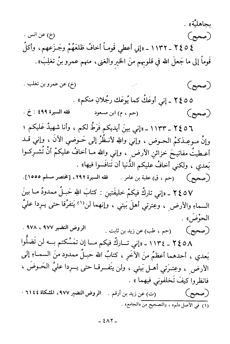 2457 - «إني تارك فيكم خليفتين: كتاب الله حبل ممدود ما بين السماء والأرض وعترتي أهل بيتي وإنهما لن1 يتفرقا حتى يردا علي الحوض» .