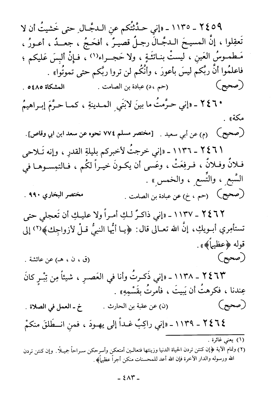 2459 - 1135 - «إني حدثتكم عن الدجال حتى خشيت أن لا تعقلوا إن المسيح الدجال رجل قصير أفحج جعد أعور مطموس العين ليست بناتئة ولا حجراء1 فإن ألبس عليكم فاعلموا أن ربكم ليس بأعور وأنكم لن تروا ربكم حتى تموتوا» .