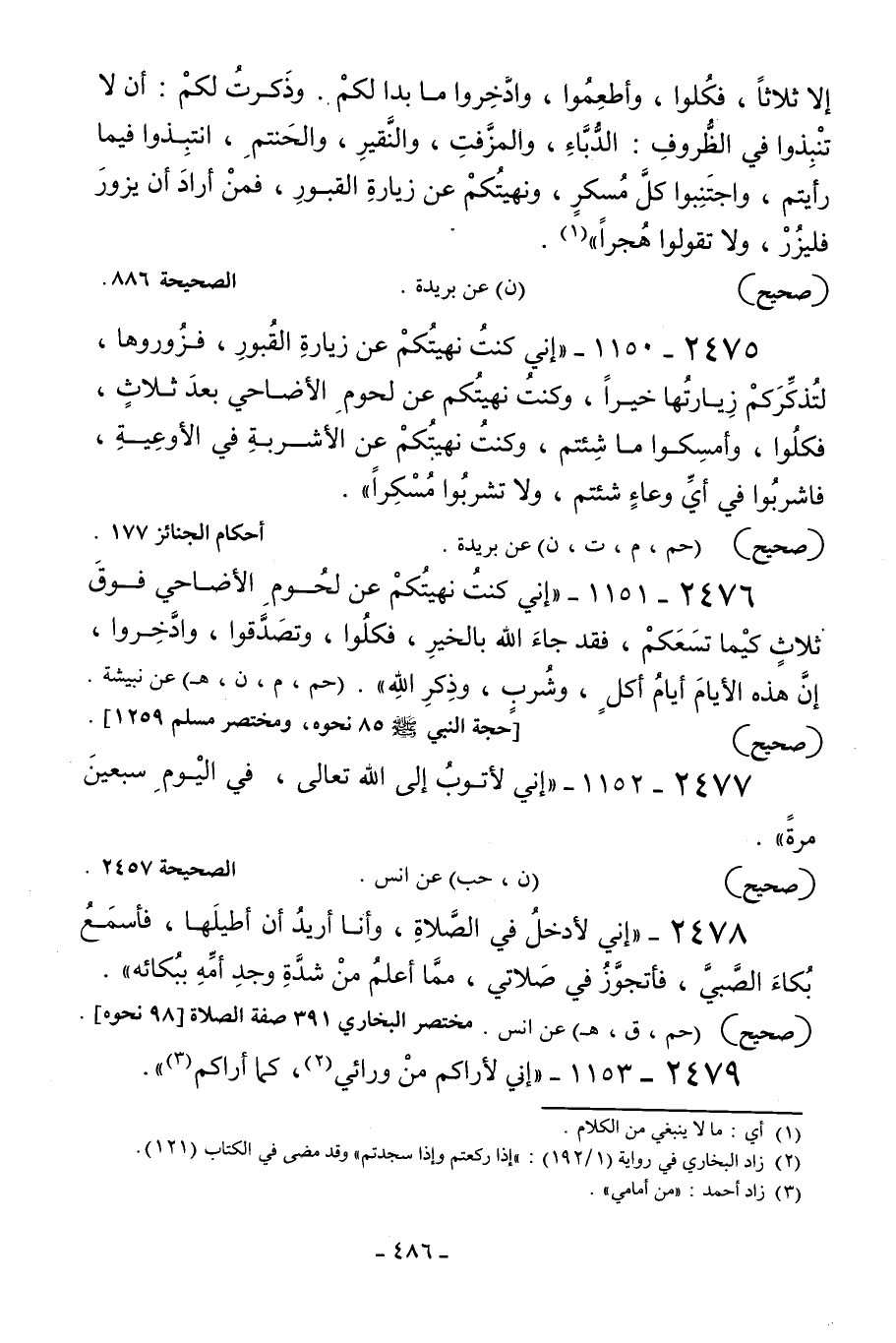 2475 - 1150 - «إني كنت نهيتكم عن زيارة القبور فزوروها لتذكركم زيارتها خيرا وكنت نهيتكم عن لحوم الأضاحي بعد ثلاث فكلوا وأمسكوا ما شئتم وكنت نهيتكم عن الأشربة في الأوعية فاشربوا في أي وعاء شئتم ولا تشربوا مسكرا» .