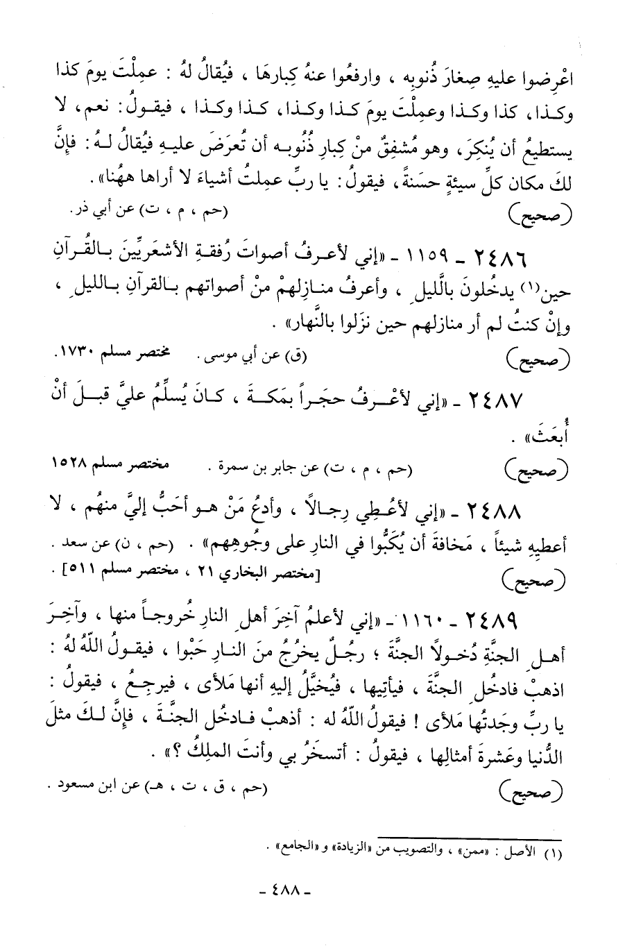 2489 - 1160 - «إني لأعلم آخر أهل النار خروجا منها وآخر أهل الجنة دخولا الجنة رجل يخرج من النار حبوا فيقول الله له: اذهب فادخل الجنة فيأتيها فيخيل إليه أنها ملأى فيرجع فيقول: يا رب وجدتها ملأى! فيقول الله له: أذهب فأدخل الجنة فإن لك مثل الدنيا وعشرة أمثالها فيقول: أتسخر بي وأنت الملك؟» .