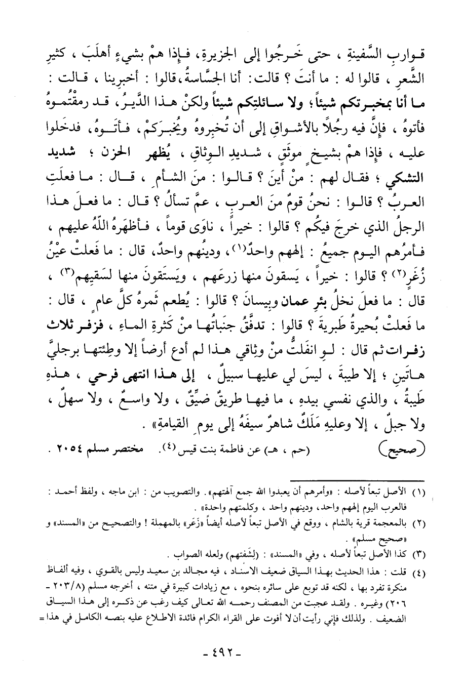 قوارب السفينة حتى خرجوا إلى الجزيرة فإذا هم بشيء أهلب كثير الشعر قالوا له: ما أنت؟ قالت: أنا الجساسة; قالوا: أخبرينا قالت: [ما أنا بمخبرتكم شيئا ولا سائلتكم شيئا] ولكن هذا الدير قد رمقتموه فأتوه فإن فيه رجلا بالأشواق إلى أن تخبروه ويخبركم فأتوه فدخلوا عليه فإذا هم بشيخ موثق شديد الوثاق [يظهر الحزن شديد التشكي] فقال لهم: من أين؟ قالوا: من الشام قال: ما فعلت العرب؟ قالوا: نحن قوم من العرب عم تسأل؟ قال: ما فعل هذا الرجل الذي خرج فيكم؟ قالوا: خيرا ناوى قوما فأظهره الله عليهم فأمرهم اليوم جميع: إلههم واحد1 ودينهم واحد قال: ما فعلت عين زغر2؟ قالوا: خيرا يسقون منها زرعهم ويستقون منها لسقيهم3 قال: ما فعل نخل [بئر عمان] وبيسان؟ قالوا: يطعم ثمره كل عام قال: ما فعلت بحيرة طبرية؟ قالوا: تدفق جنباتها من كثرة الماء; [فزفر ثلاث زفرات] ثم قال: لو انفلت من وثاقي هذا لم أدع أرضا إلا وطئتها برجلي هاتين إلا طيبة ليس لي عليها سبيل [إلى هذا انتهى فرحي] هذه طيبة والذي نفسي بيده ما فيها طريق ضيق ولا واسع ولا سهل ولا جبل إلا وعليه ملك شاهر سيفه إلى يوم القيامة".