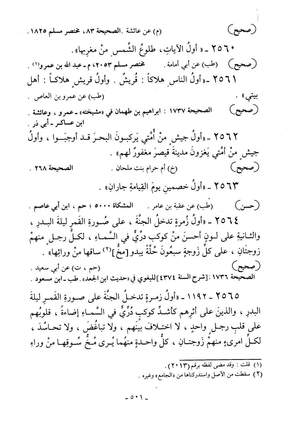 2564 - «أول زمرة تدخل الجنة على صورة القمر ليلة البدر والثانية على لون أحسن من كوكب دري في السماء لكل رجل منهم زوجتان على كل زوجة سبعون حلة يبدو مخ2 ساقها من ورائها» .
