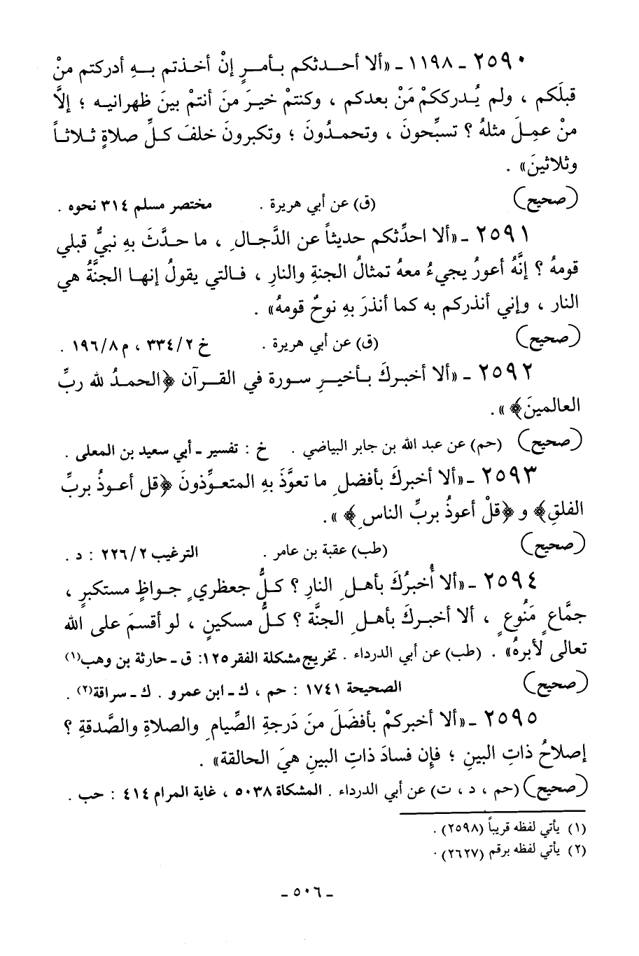 2590 - 1198 - «ألا أحدثكم بأمر إن أخذتم به أدركتم من قبلكم ولم يدرككم من بعدكم وكنتم خير من أنتم بين ظهرانيه إلا من عمل مثله؟ تسبحون وتحمدون وتكبرون خلف كل صلاة ثلاثا وثلاثين» .