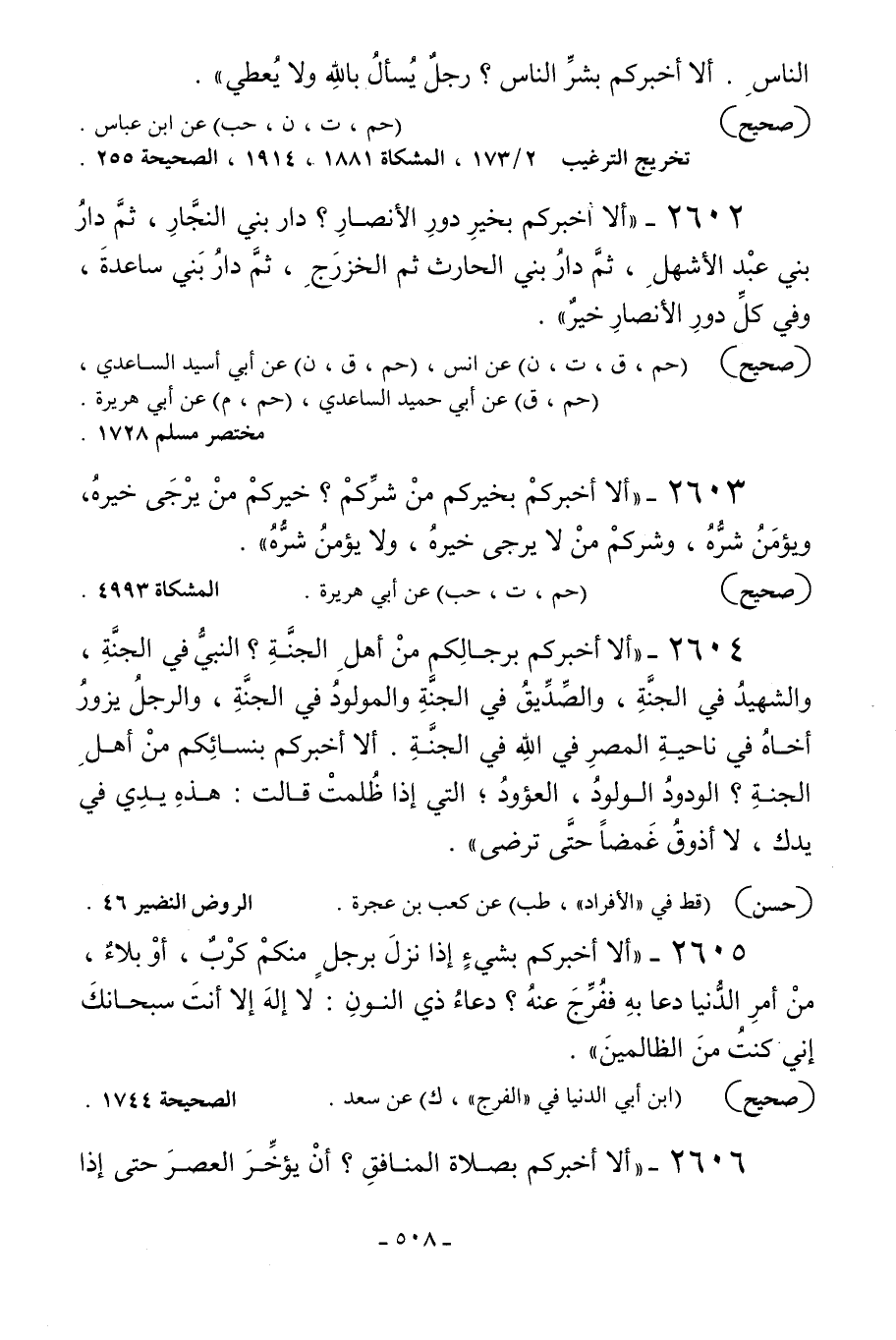 2602 - «ألا أخبركم بخير دور الأنصار؟ دار بني النجار ثم دار بني عبد الأشهل ثم دار بني الحارث ثم الخزرج ثم دار بني ساعدة وفي كل دور الأنصار خير» .