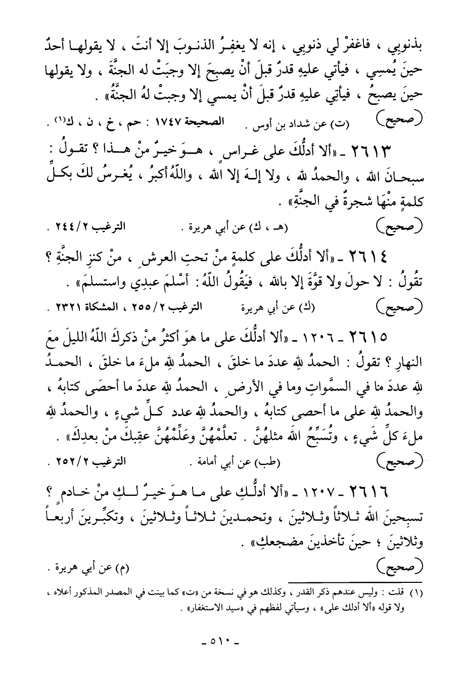 1 قلت: وليس عندهم ذكر القدر، وكذلك هو في نسخة من [ت] كما بينت في المصدر المذكور أعلاه، ولا قوله [ألا أدلك على] , وسيأتي لفظهم في [سيد الاستغفار] .