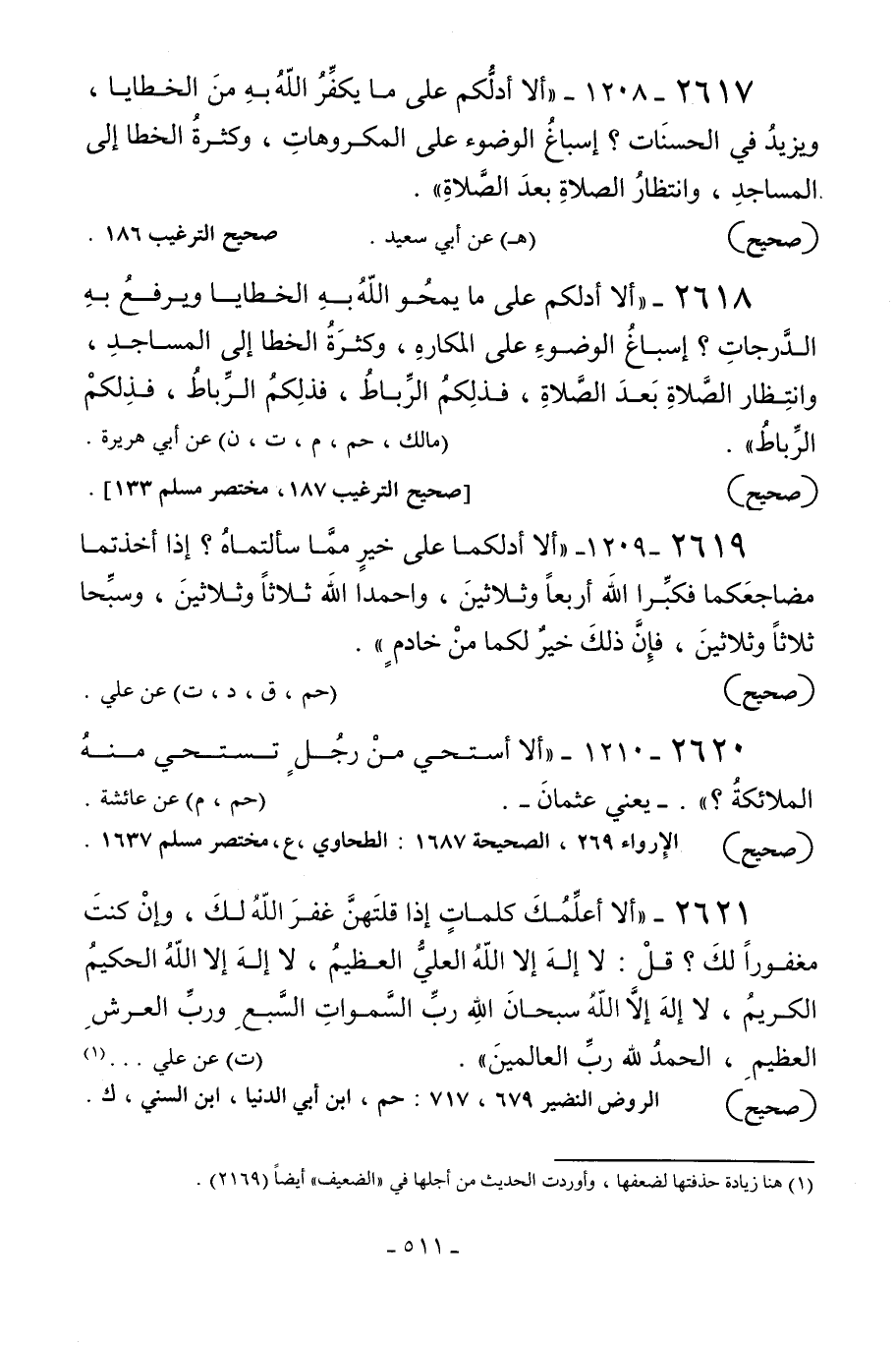 2617 - 1208 - «ألا أدلكم على ما يكفر الله به من الخطايا ويزيد في الحسنات؟ إسباغ الوضوء على المكروهات وكثرة الخطا إلى المساجد وانتظار الصلاة بعد الصلاة» .