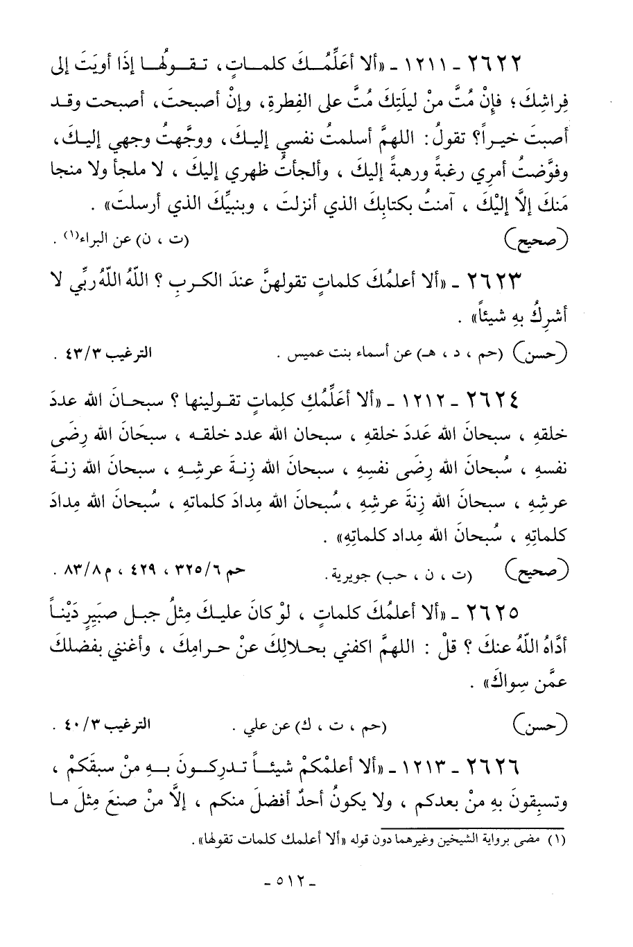 2624 - 1212 - «ألا أعلمك كلمات تقولينها؟ سبحان الله عدد خلقه سبحان الله عدد خلقه سبحان الله عدد خلقه سبحان الله رضا نفسه سبحان الله رضا نفسه سبحان الله رضا نفسه سبحان الله زنة عرشه سبحان الله زنة عرشه سبحان الله زنة عرشه سبحان الله مداد كلماته سبحان الله مداد كلماته سبحان الله مداد كلماته» .