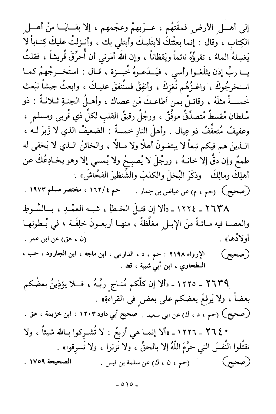 2640 - 1226 - «ألا إنما هي أربع: لا تشركوا بالله شيئا ولا تقتلوا النفس التي حرم الله إلا بالحق ولا تزنوا ولا تسرقوا» .