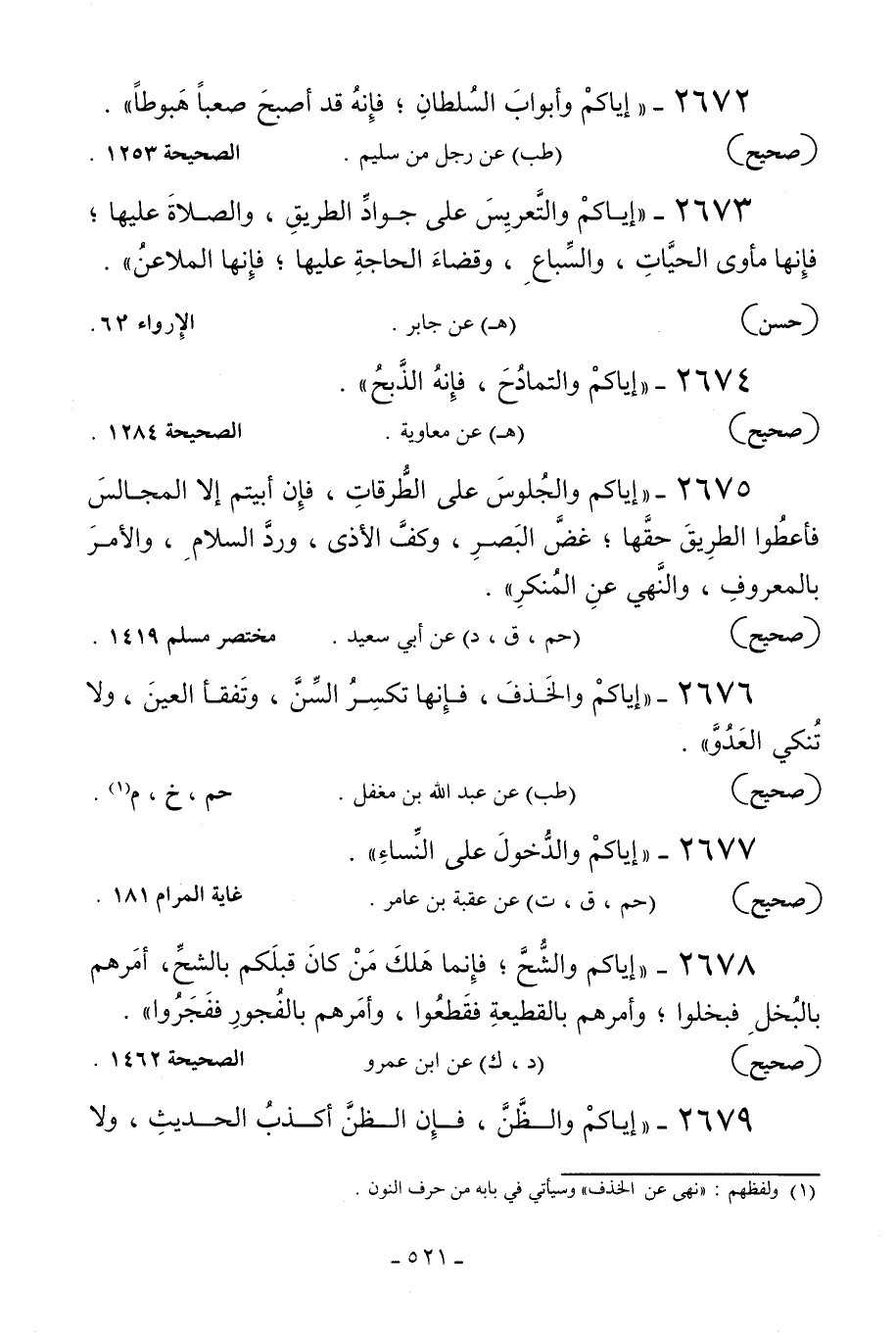 2675 - «إياكم والجلوس على الطرقات فإن أبيتم إلا المجالس فأعطوا الطريق حقها غض البصر وكف الأذى ورد السلام والأمر بالمعروف والنهي عن المنكر» .