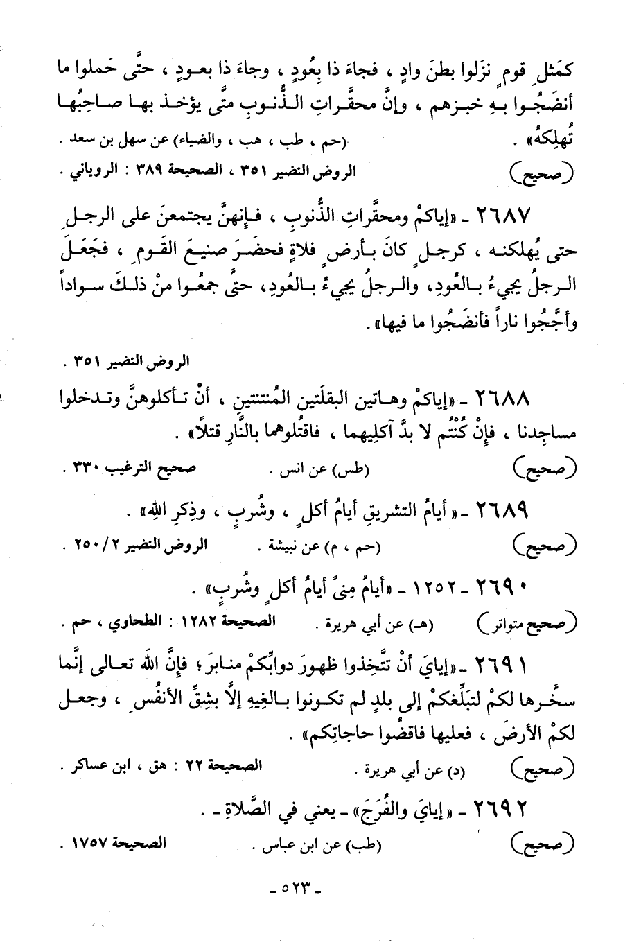 2687 - «إياكم ومحقرات الذنوب فإنهن يجتمعن على الرجل حتى يهلكنه كرجل كان بأرض فلاة فحضر صنيع القوم فجعل الرجل يجيء بالعود والرجل يجيء بالعود حتى جمعوا من ذلك سوادا وأججوا نارا فأنضجوا ما فيها» .