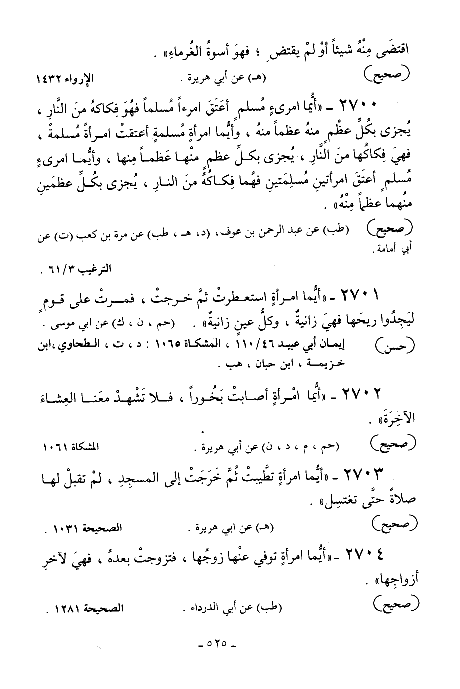 2701 - «أيما امرأة استعطرت ثم خرجت فمرت على قوم ليجدوا ريحها فهي زانية وكل عين زانية» .