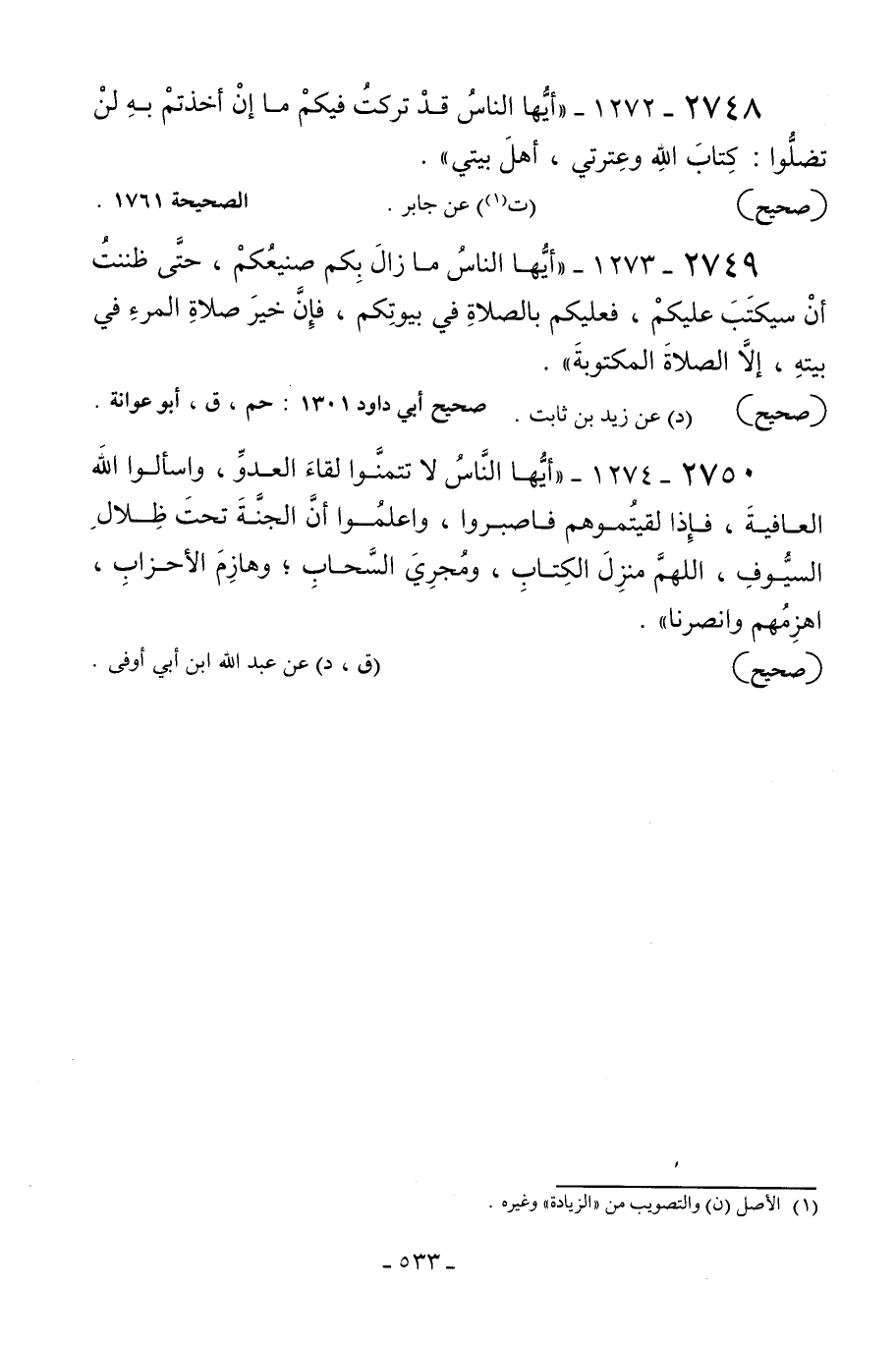 2750 - 1274 - «أيها الناس لا تتمنوا لقاء العدو واسألوا الله العافية فإذا لقيتموهم فاصبروا واعلموا أن الجنة تحت ظلال السيوف اللهم منزل الكتاب ومجري السحاب وهازم الأحزاب اهزمهم وانصرنا عليهم» .
