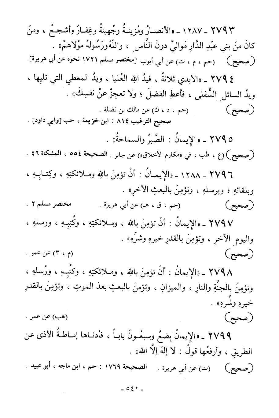 2799 – [الإيمان بضع وسبعون بابا فأدناها إماطة الأذى عن الطريق وأرفعها قول: لا إله إلا الله] .