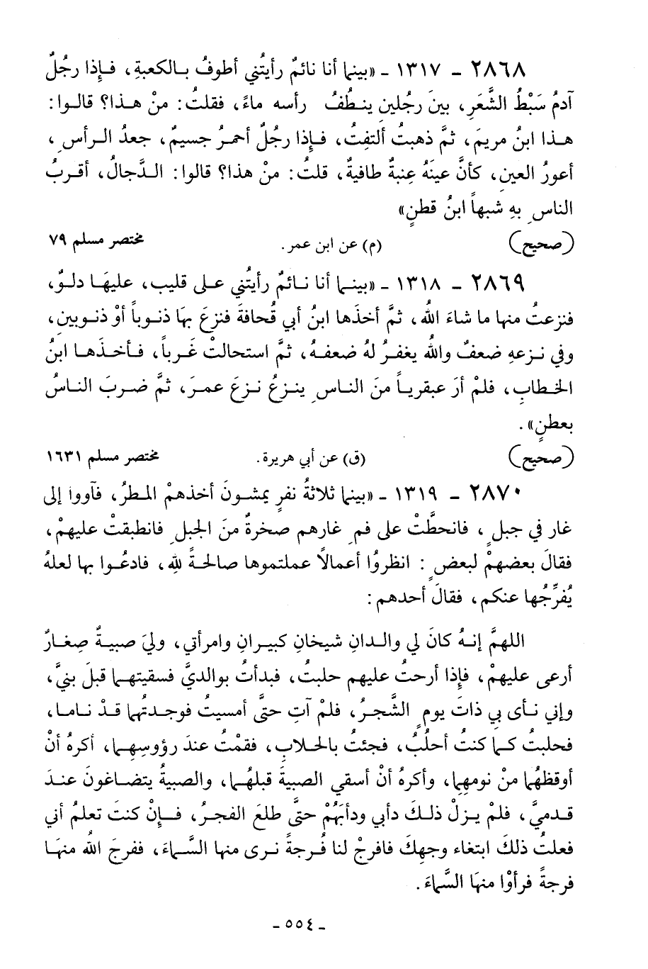 2870 - 1319 - "بينما ثلاثة نفر يمشون أخذهم المطر فآووا إلى غار في جبل فانحطت على فم غارهم صخرة من الجبل فانطبقت عليهم فقال بعضهم لبعض: انظروا أعمالا عملتموها صالحة لله فادعوا بها لعله يفرجها عنكم; فقال أحدهم: اللهم إنه كان لي والدان شيخان كبيران وامرأتي ولي صبية صغار أرعى عليهم فإذا أرحت عليهم حلبت فبدأت بوالدي فسقيتهما قبل بني وإني نأى بي ذات يوم الشجر فلم آت حتى أمسيت فوجدتهما قد ناما فحلبت كما كنت أحلب فجئت بالحلاب فقمت عند رءوسهما أكره أن أوقظهما من نومهما وأكره أن أسقى الصبية قبلهما والصبية يتضاغون عند قدمي فلم يزل ذلك دأبي ودأبهم حتى طلع الفجر فإن كنت تعلم أني فعلت ذلك ابتغاء وجهك فافرج لنا فرجة نرى منها السماء ففرج الله منها فرجة فرأوا منها السماء;