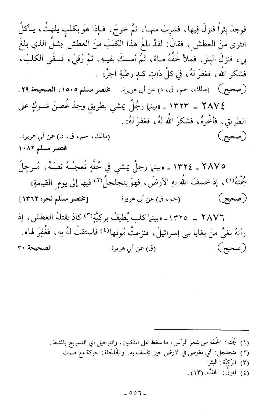 2876 - 1325 - «بينما كلب يطيف بركية3 كاد يقتله العطش إذ رأته بغي من بغايا بني إسرائيل فنزعت موقها4 فاستقت له به فغفر لها» .