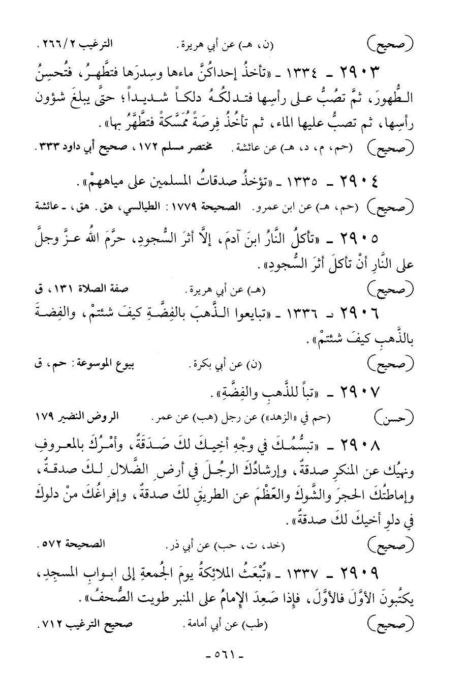 2908 - «تبسمك في وجه أخيك لك صدقة وأمرك بالمعررف ونهيك عن المنكر صدقة وإرشادك الرجل في أرض الضلال لك صدقة وإماطتك الحجر والشوك والعظم عن الطريق لك صدقة وإفراغك من دلوك في دلو أخيك لك صدقة» .