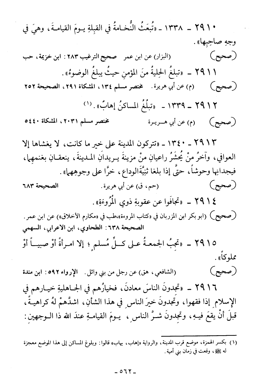 2913 - 1340 - «تتركون المدينة على خير ما كانت لا يغشاها إلا العوافي وآخر من يحشر راعيان من مزينة يريدان المدينة ينعقان بغنمهما فيجدانها وحوشا حتى إذا بلغا ثنية الوداع خرا على وجوههما» .