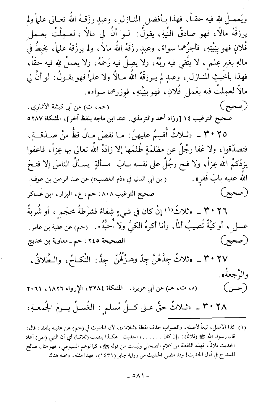 3025 - «ثلاث أقسم عليهن: ما نقص مال قط من صدقة فتصدقوا ولا عفا رجل عن مظلمة ظلمها إلا زاده الله تعالى بها عزا فاعفوا يزدكم الله عزا ولا فتح رجل على نفسه باب مسألة يسأل الناس إلا فتح الله عليه باب فقر» .