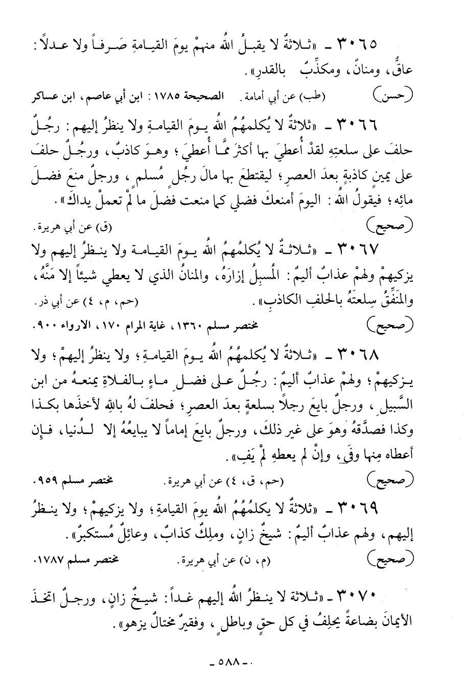3070 - «ثلاثة لا ينظر الله إليهم غدا: شيخ زان ورجل اتخذ الأيمان بضاعة يحلف في كل حق وباطل وفقير مختال يزهو» .